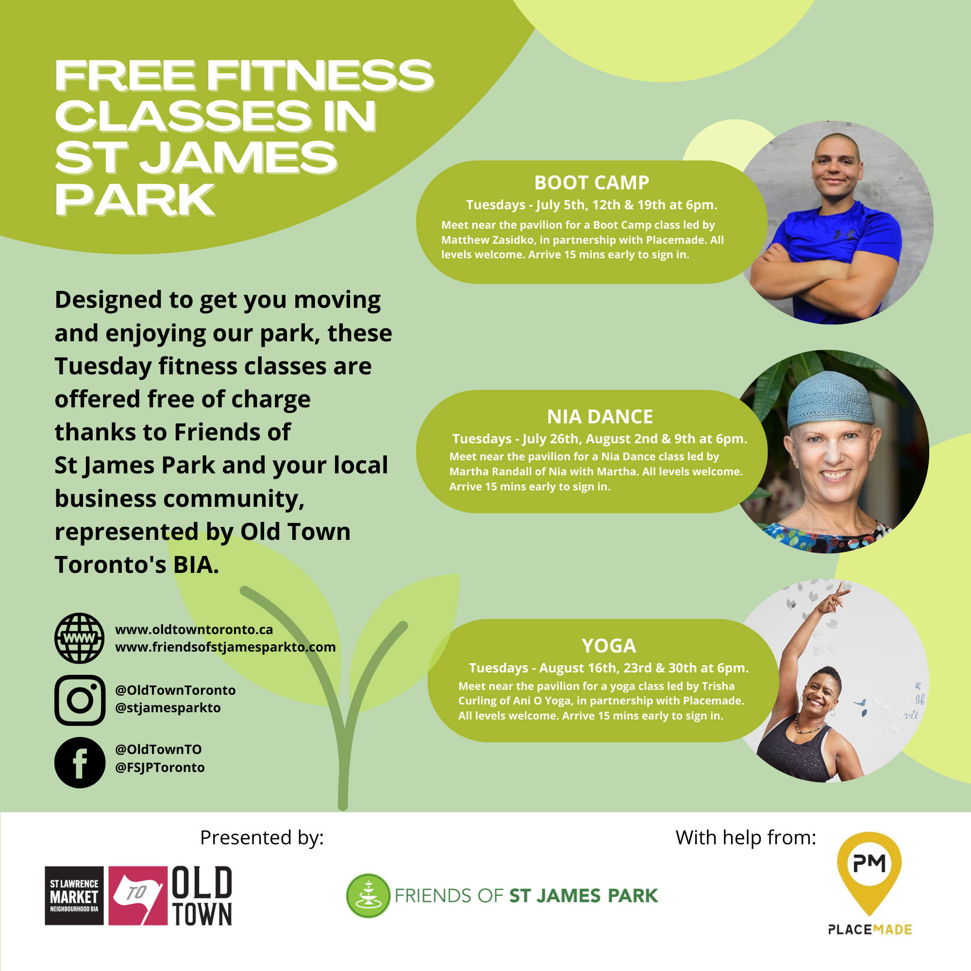Hosted by the St Lawrence Market Neighbourhood BIA, Friends of St. James Park, and with help from PlaceMade, anyone can join one or all three classes: 1) Boot Camp for 3 weeks starting July 5th with Matthew Zasidko, 2) Nia Dance for 3 weeks starting July 26th with Martha Randall, and 3) Yoga for 3 weeks starting August 16th with Trisha Curling. Meet at the pavilion!