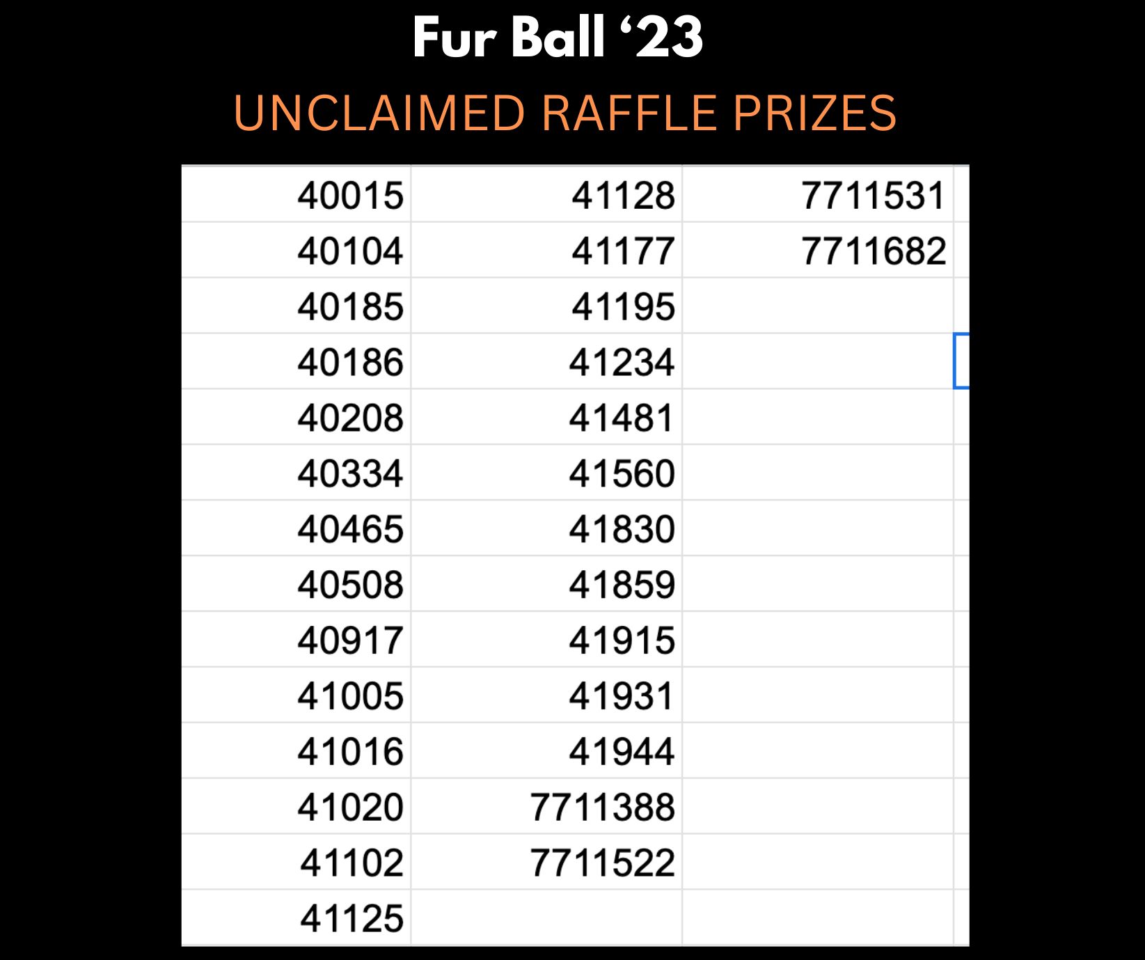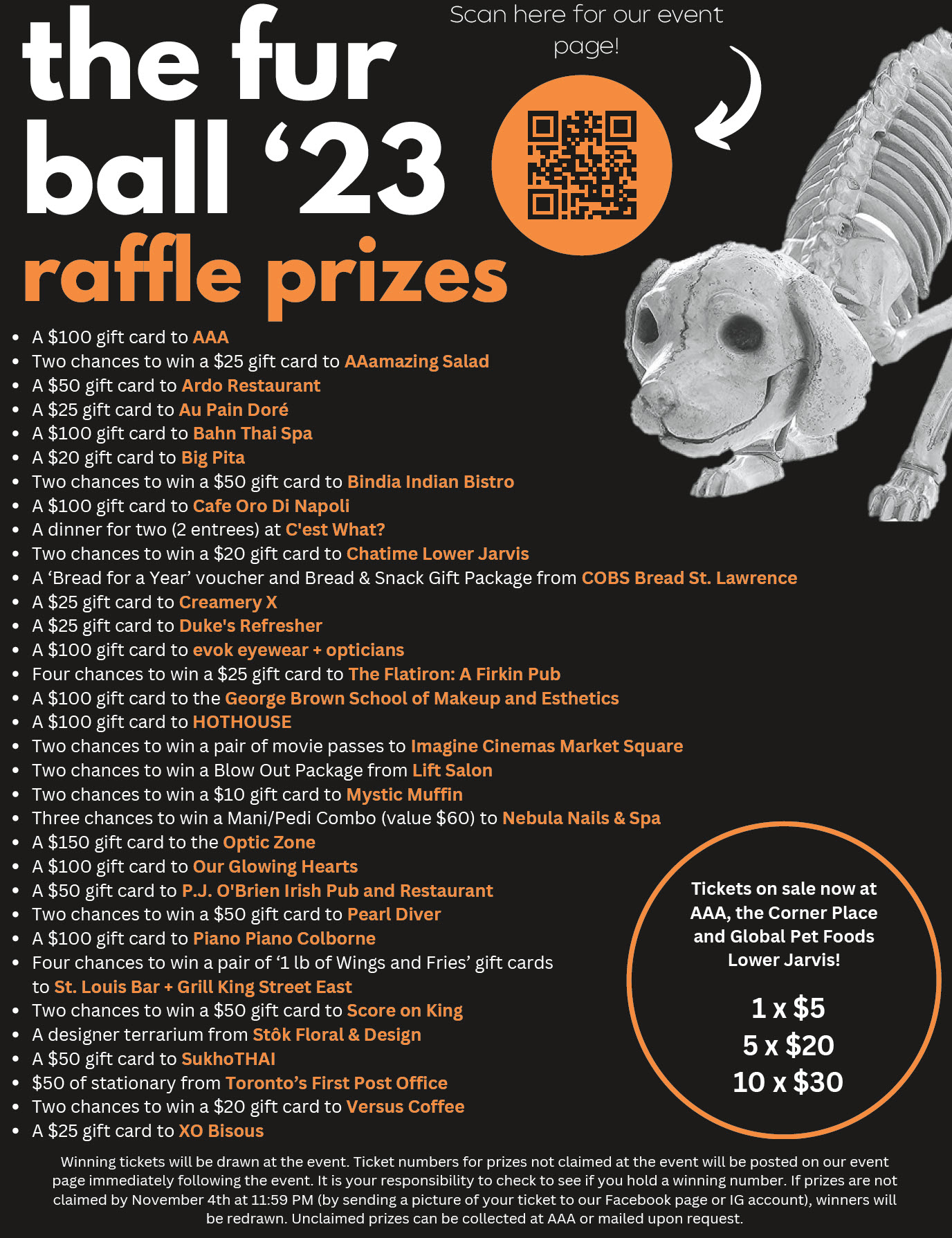 It is your responsibility to check to see if you hold a winning number. If prizes are not claimed by November 4th at 11:59 PM (by sending a picture of your ticket to our Facebook page, IG account @dogsofstjamespark, or email address – dogsofstjamesto@gmail.com), winners will be redrawn. Unclaimed prizes can be collected at AAA or mailed upon request.