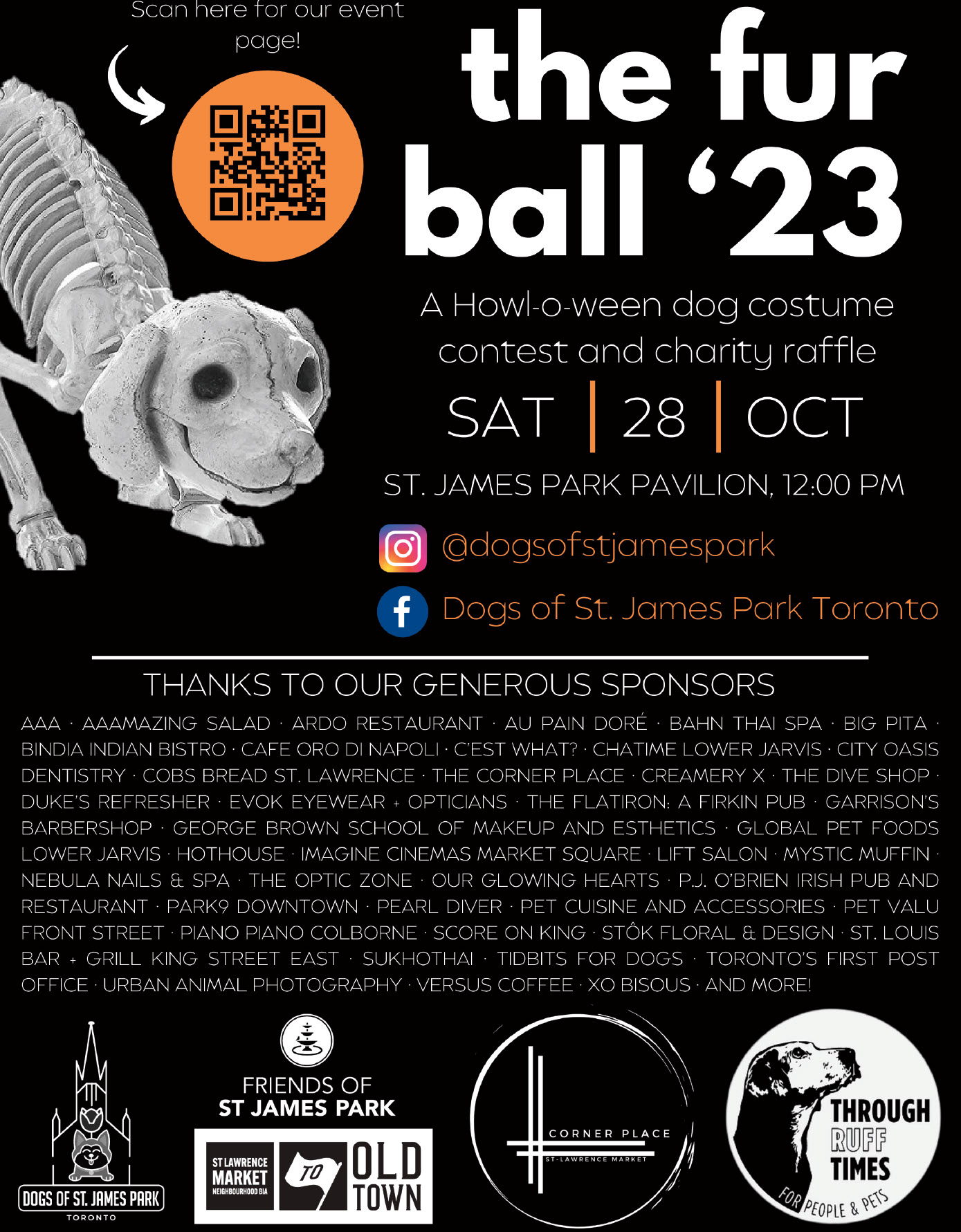 It’s back! We have partnered again with the Dogs of St. James Park, along with AAA Bar, The Corner Place, Through Ruff Times, and Old Town Toronto to bring back the Fur Ball ’23: A Howl-o-ween dog costume contest and charity raffle. The big day is Saturday, October 28, 2023 at 12 pm in St. James Park at the Michael Comstock Pavilion.