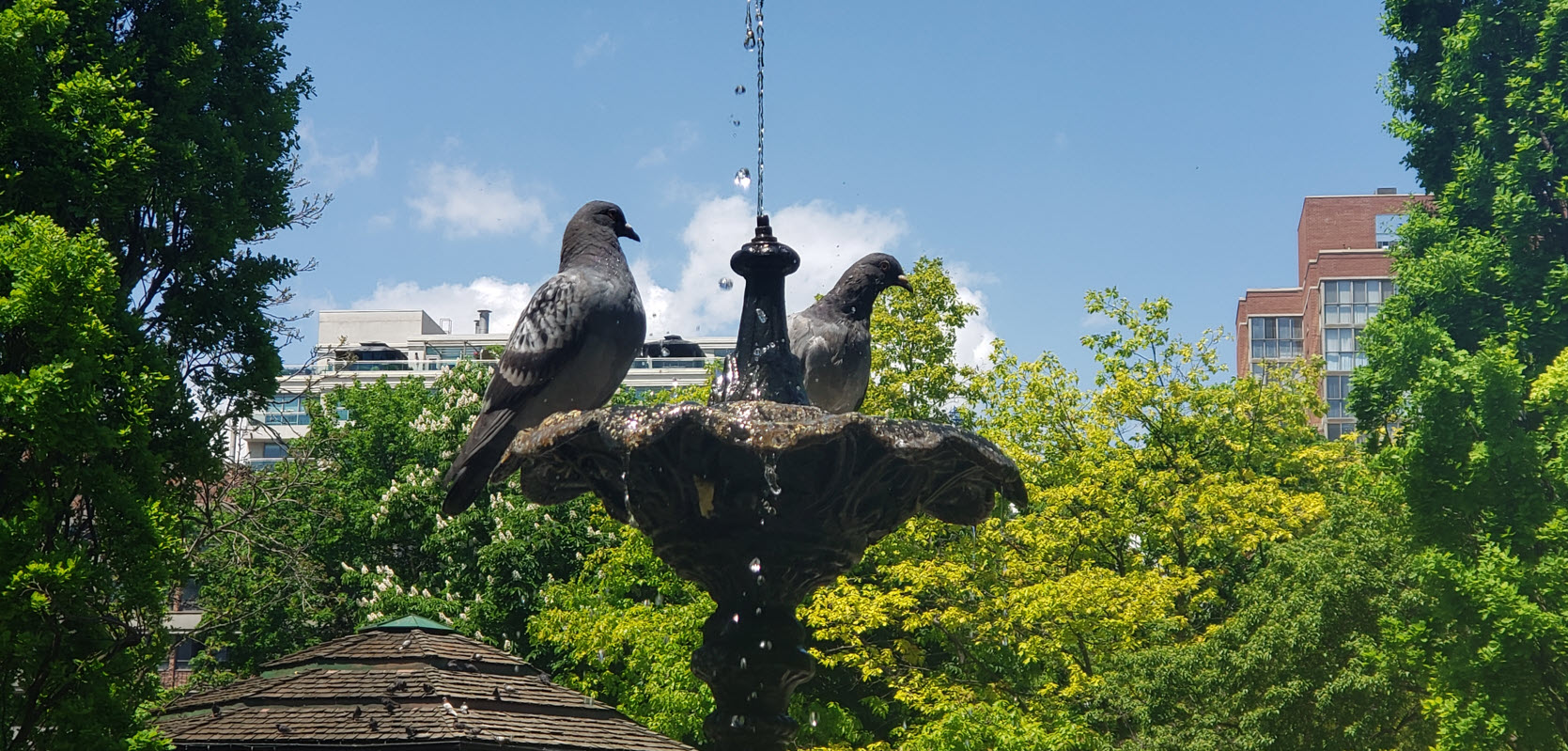 There are a couple of behaviours that you will notice displayed by the pigeons in the park. Pigeons can get sick if they overheat, so they often pant with their beak open and hold their wings away from their body to cool down.